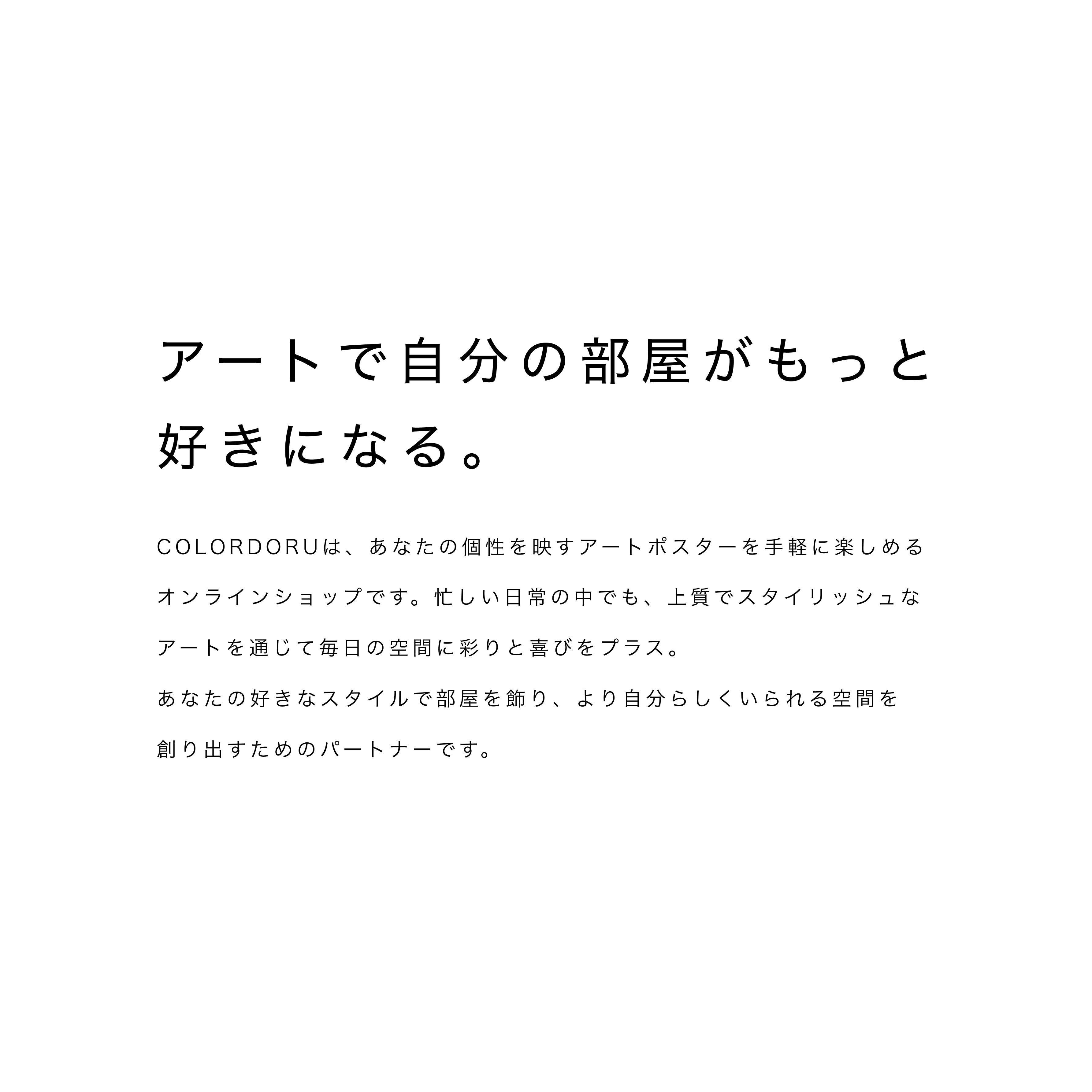 アートは日常に喜びや癒しをもたらし部屋の雰囲気を一新する力を持っているため、取り入れることで自分が一番好きになれる場所をつくることができ、何気ない毎日に彩りと癒し、喜びが生まれます。一人ひとりの好みやニーズに沿った作品を多種多様なスタイルのアートの中からお届けすることで、COLORDORUはお客様が自分らしくいられる空間を創り出すためのパートナーになります。